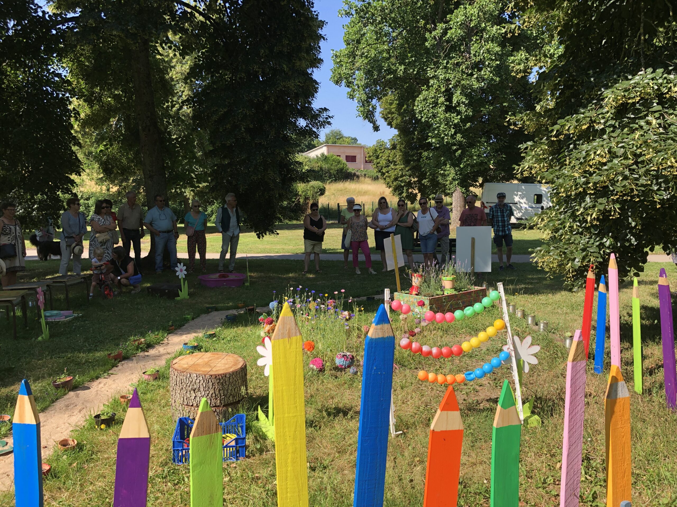 Différents espaces proposant des jeux préparés par les enfants en lien avec la nature et les mathématique.