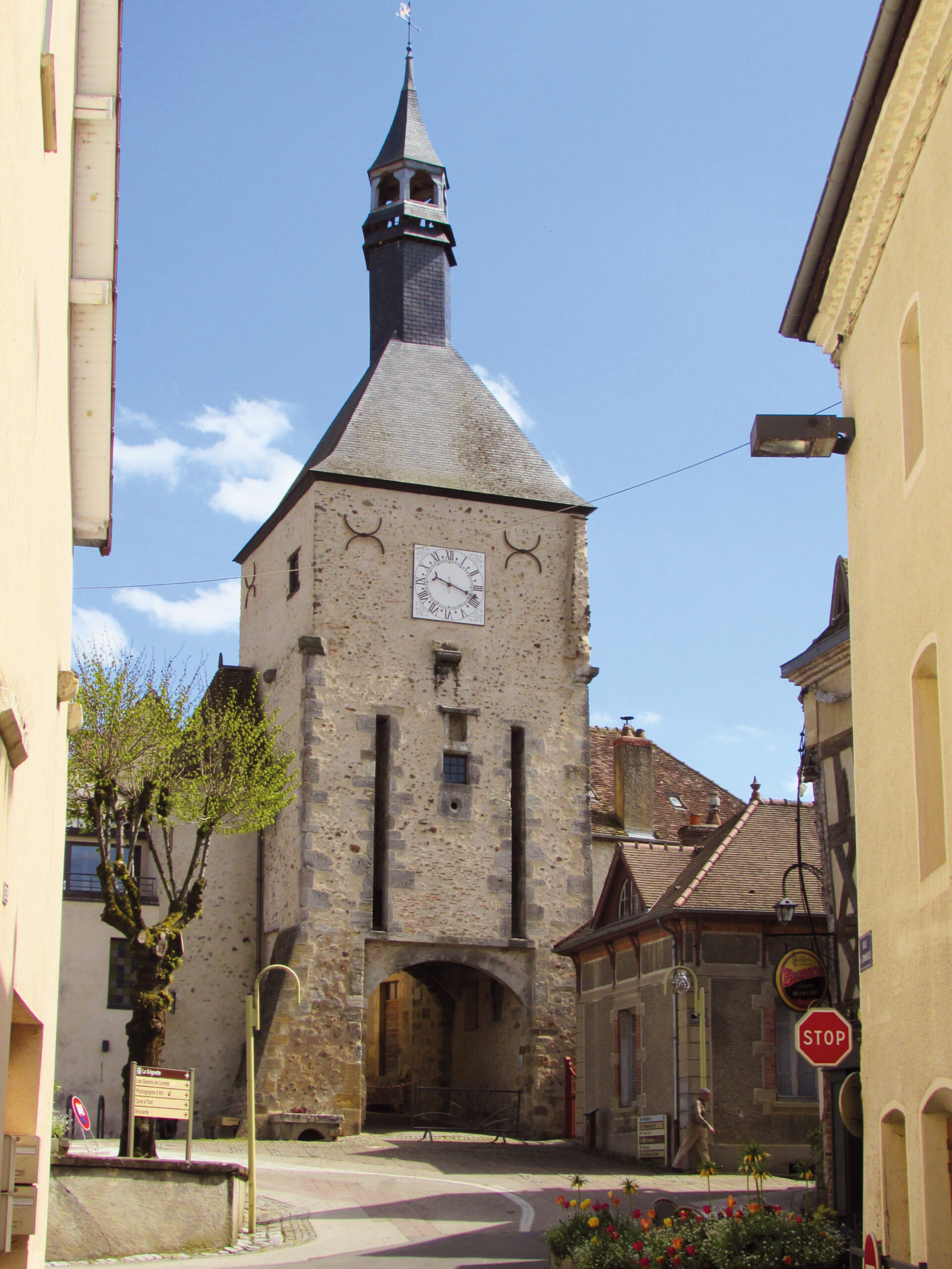 Deux grosses tours de défense marquent la limite de la cité sur le côté opposé au château. La « Tour du Midy » existe toujours à l’extrémité du chemin longeant le rempart, presque intacte, quoique souvent remaniée. La « Tour d’Orient » jouxte la Mairie. Au pied du beffroi, la rue du Château donne accès au promontoire où dominait le château fort. Il n’en reste rien sinon des murs de soubassement et quelques traces des bases de tours. Sa démolition a commencé dès 1775. Elle ne fut achevée qu’en 1830. Il aura fallu plus de 50 ans pour raser cette imposante forteresse.
